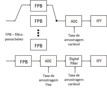 Ao usar filtragem digital, a taxa de amostragem do ADC não tem de ser mudada. De facto, esta taxa é sempre a taxa máxima correspondente à máxima frequência do analisador.